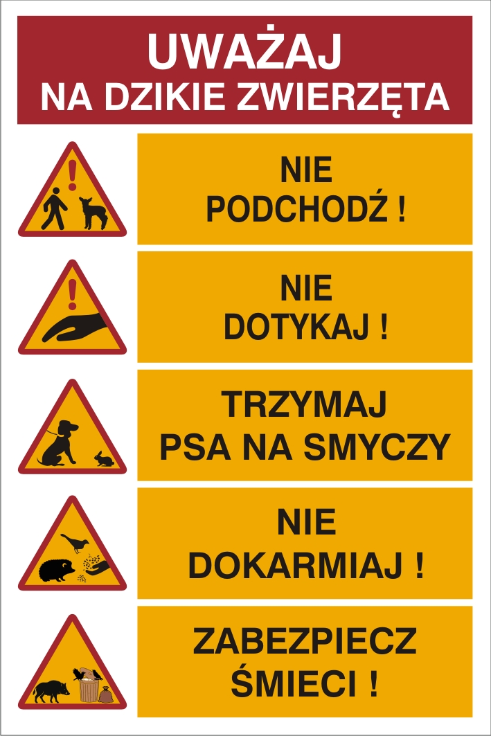Znak informacyjno-ostrzegawczy przypominajacy o zasadach bezpieczeństwa przy bezpośrednim spotkaniu z dzikimi zwierzętami. Hasła umieszczone na znaku: nie podchodź!, nie dotykaj!, trzymaj psa na smyczy, nie dokarmiaj!, zabezpiecz śmieci!