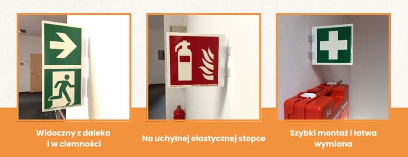 Znak uchylny to nowoczesna forma znaku bezpieczeństwa, zaprojektowana z myślą o maksymalnej widoczności w magazynach, wąskich przejściach oraz miejscach o dużym natężeniu ruchu. Dzięki specjalnej, częściowo elastycznej, plastikowej stopce montażowej znak można zamontować prostopadle do ściany, co pozwala na jego łatwe zauważenie z obu kierunków a jednocześnie znak może się uchylać lub wychylać w sytuacji przypadkowego z nim kontaktu.